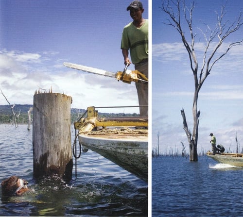 Wenn in einem Urwald Holz eingeschlagen wird, müssen dazu zunächst mit großem Aufwand Straßen angelegt werden, die oft nachhaltig größere Schäden im Wald verursachen als das Schlagen des Holzes selbst. Bei Stauseeholz erfolgen die Ernte und der Transport völlig anders: Kleine Boote mit Tauchern ernten den im See versunkenen Wald systematisch ab. Da die meisten Stämme schwerer sind als Wasser, müssen sie gesichert werden, bevor sie mit einer durch Pressluft angetriebenen Kettensäge unter Wasser in einer Tiefe bis zu 35 m abgeschnitten werden.
